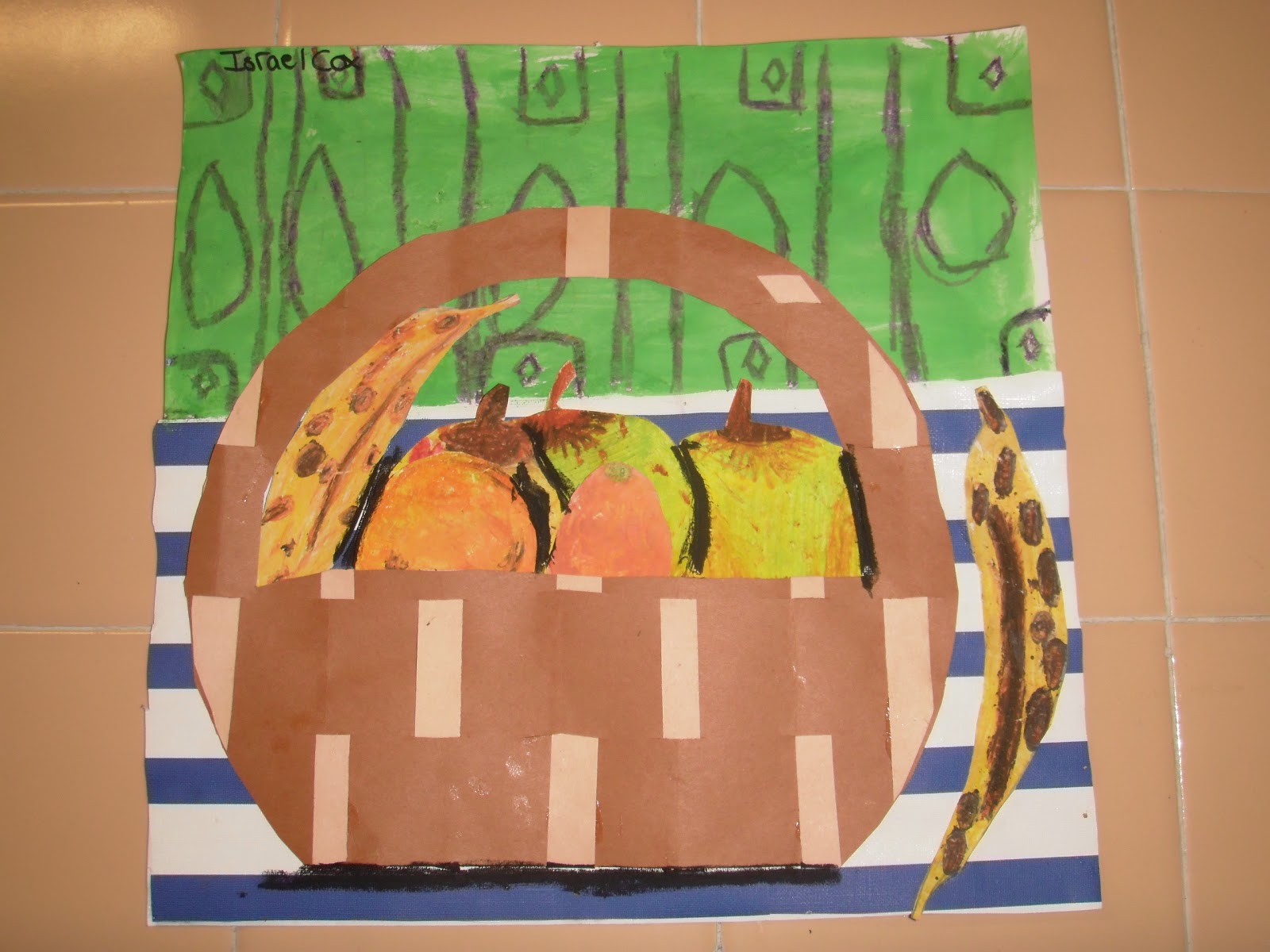 The first thing we started with was the background. We made our line separating the Wall from the table. The Wall was made doing a crayon resist. The students used Crayons to draw a design on their Wall and then painted on top using watercolors. If you have never done this before what happens is, the wax from the crayon repels the watercolors, causing the crayon to show through and the watercolor paint to fill in the empty spaces creating a nice effect.